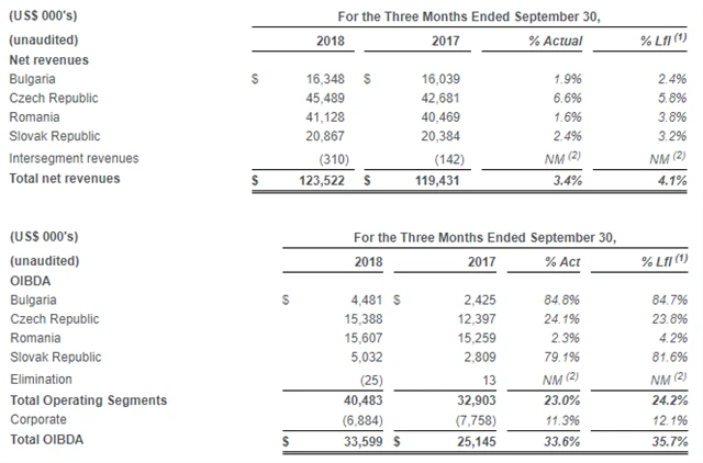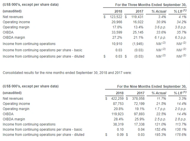 Provozní zisk OIBDA se meziročně zvýšil z 25,15 milionu dolarů na 33,6 milionu dolarů. Čisté tržby se zvýšily o 3,4 %, bez vlivu změn měnových kurzů dokonce o 4,1 %. OIBDA marže vyskočila o 6,1 procentního bodu na 27,2 %. Na úrovni zisku z pokračujících operací vykázala společnost výsledek 10,91 milionu dolarů, za loňský třetí kvartál reportovala firma záporný výsledek 1,95 milionu dolarů.