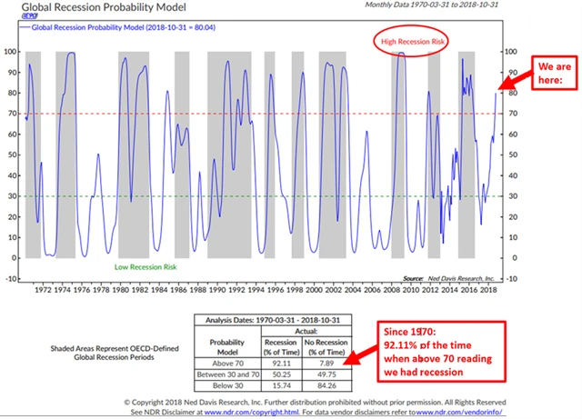 Analytici z Ned Davis Research v této době velice trefně poukázali na indikátor, který naznačuje pravděpodobnost nástupu globální recese. "Hodnoty nad 70 od roku 1970 předznamenaly světovou recesi v 92,11 % případů. Nyní je indikátor na 80 bodech, a proto je konec expanze světové ekonomiky velice pravděpodobný," píší. "Buď již začíná, nebo k tomu brzy dojde."
