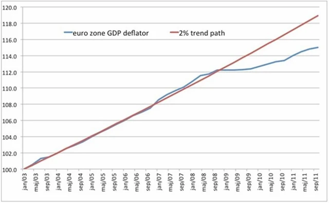 Podle deflátoru HDP byla inflace v eurozóně v posledních čtyřech letech varovně nízká, především díky splasknutí evropské nemovitostní bubliny. Od Španělska přes Irsko k Francii a Nizozemsku se trh s bydlením musí vyrovnávat s následky propadu. ECB však poklesy ignoruje a stále tvrdošíjně cíluje 2% jádrovou inflaci HICP.