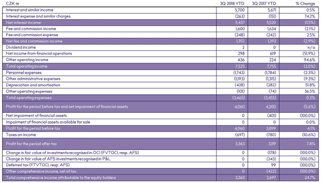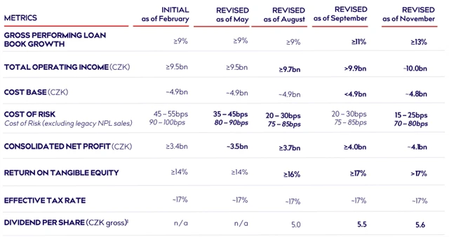 Čistý zisk na úrovni 3,36 miliardy Kč byl pozitivně ovlivněn prodejem části portfolia nesplácených úvěrů. Management díky tomu opět zvýšil odhad pro čistý zisk za celý letošní rok o dalších 100 milionů Kč na 4,1 miliardy Kč. Vedle výhledu zisku byl upraven i odhad nákladů na rizika (z 20-30 bazických bodů na 15-25 bazických bodů) či odhad provozních výnosů (z 9,9 miliardy Kč na 10 miliard Kč). Vedení společnosti by také podle aktualizovaného výhledu mělo zvážit návrh výplaty dividendy ve výši 5,60 Kč na akcii, předchozí plán počítal s výplatou 5,50 Kč na akcii. Růst nových úvěrů by měl letos činit minimálně 13 %, v září banka počítala s minimálně 11% růstem.