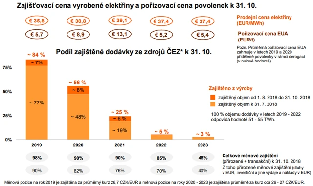 "Po letech meziročních poklesů realizačních cen vyrobené elektřiny došlo v třetím čtvrtletí k obratu a ve výsledcích hospodaření se začíná pozitivně odrážet růst ceny elektřiny na velkoobchodních trzích. V souladu s naší zajišťovací strategií pokračujeme v předprodeji elektřiny a fixaci nákladů na emisní povolenky na další roky. Na rok 2019 máme prodáno přes 84 % výroby elektřiny za 35,80 EUR/MWh a pro odpovídající objem výroby v našich uhelných elektrárnách máme zajištěny emisní povolenky za 5,70 EUR/t. Na rok 2020 máme prodáno přes 56 % výroby elektřiny za 38,80 EUR/MWh a emisní povolenky zajištěny za 8,90 EUR/t," říká předseda představenstva a generální ředitel ČEZ Daniel Beneš.