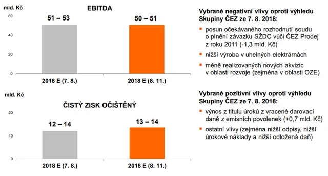 "Na úrovni celoročních očekávaných výsledků upřesňujeme výhled pro zisk EBITDA na úroveň 50-51 miliard Kč vzhledem k posunu výnosu z očekávaného rozhodnutí soudu o plnění závazku SŽDC z roku 2011 za horizont letošního roku a dále s ohledem na snížení očekávané výroby z uhelných zdrojů a vzhledem k posunu realizace nových akvizic. Současně navyšujeme výhled očištěného čistého zisku na úroveň 13-14 miliard Kč s ohledem na výnos z titulu úroků z vrácené darovací daně z emisních povolenek a s ohledem na nižší úrokové náklady, odpisy a jiné finanční náklady spojené s pořizováním nových akvizic," doplnil Martin Novák.