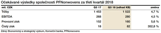 Ve čtvrtek se výsledky za uplynulé čtvrtletí pochlubí výrobce netkaných textilií PFNonwovens. "Společnost zřejmě vykáže silný růst provozního zisku EBITDA (meziročně+24 % na 333 milionů Kč). Důvodem by měl být cenový efekt. Očekáváme potvrzení výhledu ročního zisku EBITDA ve výši 1,22-1,38 miliardy Kč. Neočekáváme, že by výsledky měly mít výraznější dopad na obchodování s cennými papíry firmy. Naše projekce na 3Q2018 a reportovaná hodnota za 1H2018 odpovídají 72,1-81,6 % celoročního cíle," říká analytik Milan Vaníček z J&T Banky.