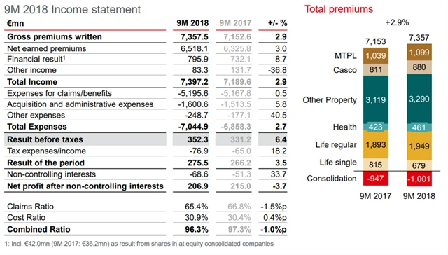 Bez započtení segmentu jednorázového životního pojištění se objem hrubého předepsaného pojistného zvýšil meziročně o 5,4 % na 6,68 miliardy eur. Objem hrubého předepsaného pojistného v segmentu jednorázového životního pojištění dosáhl 679 milionů eur, loni to ve stejném období bylo 815 milionů eur.