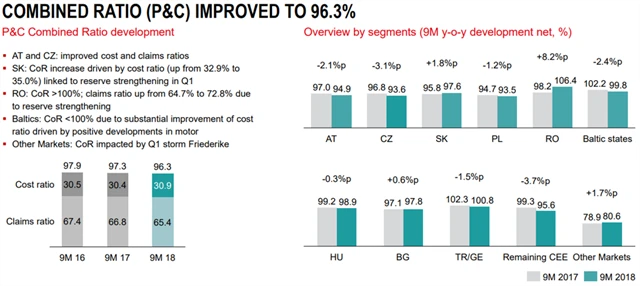 V České republice kombinovaný poměr meziročně klesl z 96,8 % na 93,6 %, v Rakousku se snížil z 97 % na 94,9 %, na Slovensku se zvýšil z 95,8 % na 97,6 %, v Polsku klesl z 94,7 % na 93,5 % a v Rumunsku se zvýšil z 98,2 % na 106,4 %. Pobaltské trhy vykázaly kombinovaný poměr 99,8 % po 102,2 % za prvních devět měsíců loňského roku.