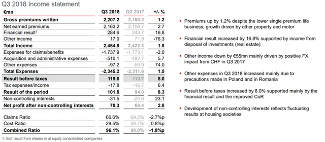 Za samotné třetí čtvrtletí VIG vykázala hrubé předepsané pojistné 2,21 miliardy eur (meziročně +1,2 %), zisk před zdaněním 119,6 milionu eur (meziročně +8 %) a čistý zisk 70,3 milionu eur (meziročně +2,8 %).
