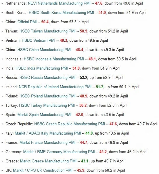 Řecko, Itálie, Irsko a Rusko - manažeři firem téměř všude na světě čekají zhoršení ekonomických podmínek, ve zmíněných čtyřech zemích se však očekávání zlepšila. Je ovšem potřeba vidět, z jakých úrovní, a mít na paměti, že hodnota pod 50 bodů signalizuje další zpomalování ekonomiky. Ještě nás dnes čekají údaje z USA, Kanady, Mexika a několika dalších zemí, kde by statistika mohla být o něco lepší, pohled na evropská a asijská data (včetně čínských) je ovšem velice varující.