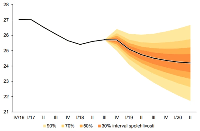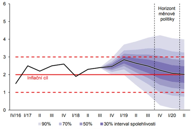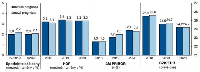 V případě inflace ČNB odhad pro čtvrté čtvrtletí příštího roku v listopadu zvýšila na 2,2 %. V srpnu centrální banka počítala s úrovní 2 %. Pro první čtvrtletí 2020 odhad banka v listopadu zvýšila na 2,1 % z 2 %.