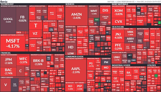 Pokles S&P 500 počítaný od historického intradenního maxima již dokonce přesáhl kritickou úroveň 20 %. Jak navíc upozornil server MarketWatch, pro Wall Street byla pondělní seance nejhorším vánočním obchodním dnem v historii.