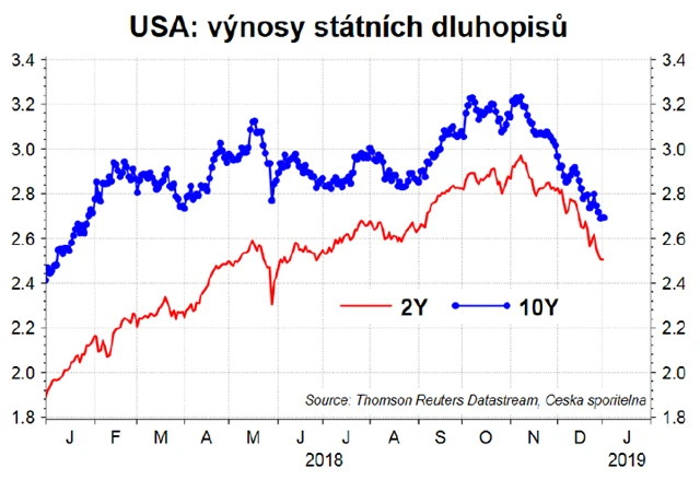 Fed nicméně koncem loňského roku začal svou rétoriku zmírňovat. Na prosincovém zasedání sice ještě plánoval zvýšit sazby v roce 2019 na 3 %, začal ale zdůrazňovat potřebu reagovat na ekonomická data. Tím si otevřel možnost revidovat výhled úroků níže. Výnosová křivka již dokonce nepočítá se žádným zvyšováním v letošním roce. Riziko chyby Fedu tak podle našeho názoru výrazně pokleslo.
