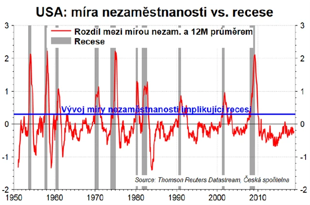 Část analytiků očekává v roce 2020 recesi v USA kvůli kombinaci příliš vysokých sazeb Fedu, vyprchání pozitivních efektů daňové reformy a obchodní války s Čínou. Fed zvýšil sazby v loňském roce o 100 bazických bodů na 2,5 %. V průběhu roku to vypadalo, že sazby porostou v roce 2019 nad 3 %, a do hry se tak dostala obava z přílišného zpřísnění měnových podmínek, což by mohlo ekonomiku USA nasměrovat k recesi. Hlavní faktory pro hospodářský výhled USA shrnuje David Navrátil, hlavní ekonom České spořitelny.