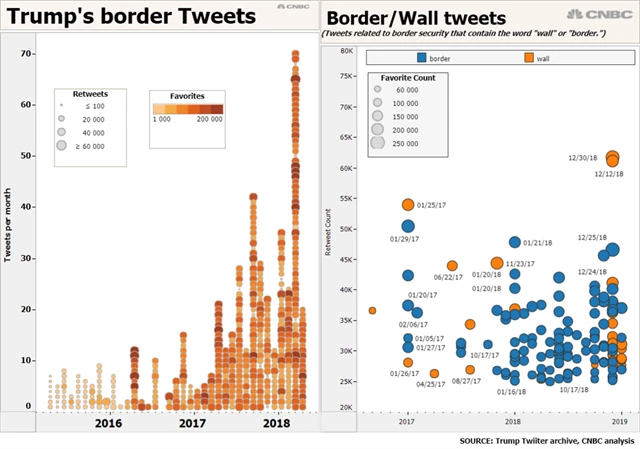 Podívejte se, jak oblíbeným tématem Trumpova účtu na Twitteru hraniční zeď je (interaktivní grafy ZDE).