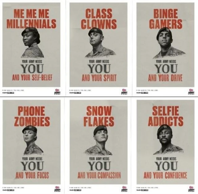 Britská armáda spustila novou náborovou kampaň, jež cílí na generaci mileniálů. Na plakátech, které se v uplynulých dnech a týdnech objevily v britských městech, armáda vyzdvihuje potřebu vášnivých hráčů s jejich nadšením či "sněhových vloček", tedy mladých empatických lidí, kteří mají své slabosti, ale chtějí dělat práci, jež má význam.