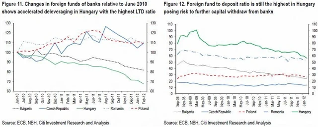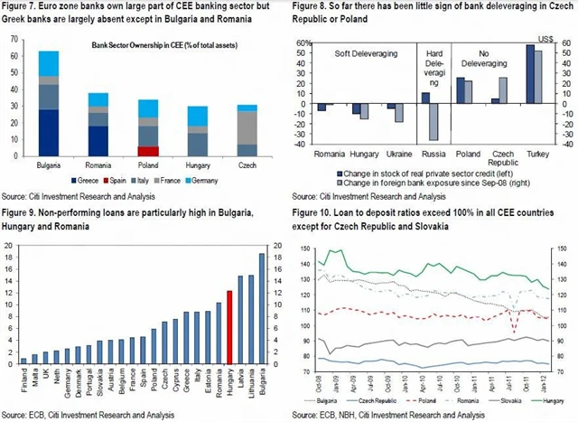 Bankovní kanál: Vzhledem k vlastnické struktuře jsou banky v Bulharsku a Rumunsku ve větší míře vystaveny otřesům vycházejících z periferie eurozóny. I maďarský bankovní systém se jeví zranitelný kvůli závislosti na zahraničním financování s vysokým podílem neziskových půjček (NPL ratio) a kvůli regulatorní a daňové zátěži na finanční sektor.