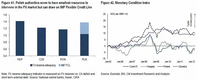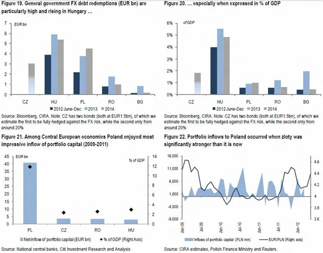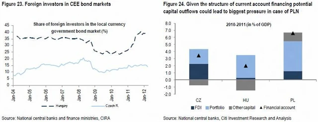 Odliv kapitálu: Polsko se mezi ekonomikami střední a východní Evropy v posledních třech letech těšilo značnému přílivu portfoliových investic (12 % HDP). Pokud Grexit povede k významnému nárůstu averze k riziku, budou tyto pozice asi sníženy. V tomto případě se polský zlotý zdá jako poměrně zranitelný kvůli kombinaci vysokého schodku běžného účtu platební bilance a jeho relativně nepříznivé struktuře financování, což je v kontrastu s Českou republikou (po vyloučení reinvestovaných zisků téměř vyrovnaný běžný účet) a s Maďarskem (přebytek).