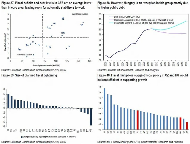 Reakce hospodářské politiky: Ve většině ekonomik střední a východní Evropy mají fiskální autority určitý manévrovací prostor, který umožňuje působení automatických stabilizátorů v případě velkých negativních šoků. Výjimkou je Maďarsko kvůli vysokému vládnímu zadlužení. Jsme přesvědčeni, že to omezuje jeho schopnost reakce hospodářské politiky, což znamená větší pravděpodobnost, že Maďarsko přijme podmínky MMF pro finanční pomoc.