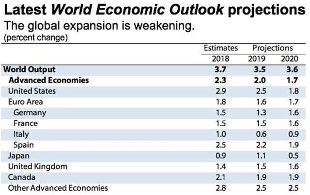 Mezinárodní měnový fond v úvodu týdne zhoršil výhled růstu světové ekonomiky. Globální hospodářský růst letos podle jeho nové prognózy zpomalí na 3,5 % z loňských 3,7 %. V říjnu přitom fond předpovídal, že tempo růstu letos zůstane na úrovni z roku 2018. Odhad růstu světové ekonomiky pro příští rok fond snížil o 0,1 procentního bodu na 3,6 %.