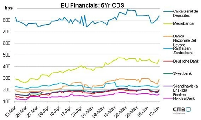 Evropské banky reagují na zprávy o pomoci těm španělským negativně, celý sektor je pod tlakem. Je to vidět i na růstu cen CDS, tedy zajišťovacích kontraktů, které se spouštějí v případě neschopnosti podkladové společnosti dostát svým závazkům. Nejhůře je na tom jedna z portugalských bank, jejíž srovnání s relativně bezpečnými bankami ze severní Evropy ukazuje, jak hluboká propast zeje mezi důvěrou ve finanční instituce z jižní Evropy a důvěrou v ty relativně bezpečné.