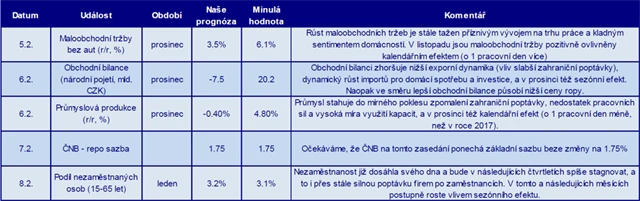 Na rozdíl od západní Evropy bude český makroekonomický kalendář pořádně nabitý. V úterý vyjdou maloobchodní tržby, ve středu obchodní bilance a průmyslová a stavební výroba. Ve čtvrtek Česká národní banka vedle nastavení sazeb oznámí také stav devizových rezerv. Na konci týdne bude ještě oznámena lednová míra nezaměstnanosti. Svůj výhled vměstnaný do tabulky nabízí analytik Jiří Polanský z České spořitelny.
