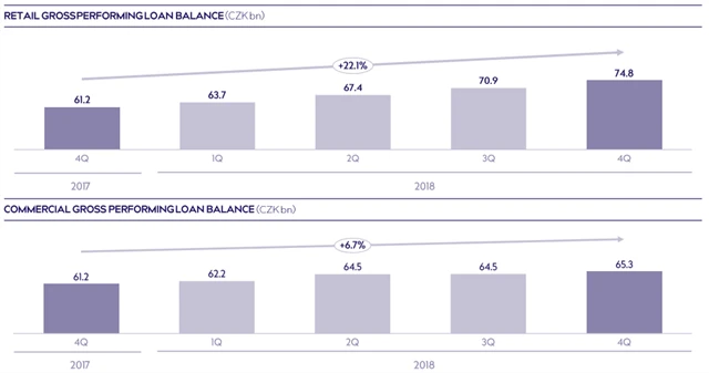 Bilance hrubých retailových úvěrů se meziročně zvýšila o 22,1 % na 74,8 miliardy Kč, a to mimo jiné díky růstu hypotečních úvěrů o 55,8 % na 31,4 miliardy Kč. Bilance hrubých úvěrů poskytnutých podnikům se meziročně zvýšila o 6,7 % na 65,3 miliardy Kč, z toho objem úvěrů pro malé firmy se zvýšil o 63,1 % na 4,5 miliardy Kč. On-line bylo poskytnuto 32 % úvěrů v retailovém segmentu a 23 % úvěrů pro malé firmy.