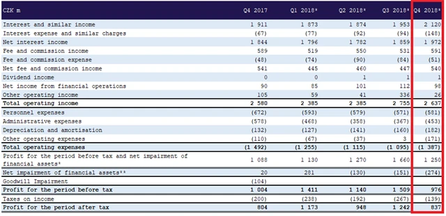 "MONETA dosáhla ve čtvrtém čtvrtletí čistého zisku 837 milionů eur, výrazně nad očekáváním trhu. Pozitivní překvapení pramení z výrazně lepších úrokových výnosů a výnosů z poplatků. Objem úvěrů bez selhání vzrostl meziročně o 14 %. Čistá úroková marže na úrovni 4,4 % byla mezikvartálně beze změny a mírně vyšší oproti čtvrtému čtvrtletí 2017. Za stabilizací výnosů z poplatků stojí především výrazný nárůst poplatků z prodeje produktů třetích stran a nižší náklady na poplatky. Provozní náklady byly meziročně o 7 % nižší. Výrazný pokles zaznamenaly jak personální náklady, jimž pomáhá pokles počtu zaměstnanců, tak ostatní administrativní náklady. Naopak vzhledem k investicím do IT a digitalizace výrazně narostly odpisy. Podíl nesplácených úvěrů klesl na 2,8 % (3 % v třetím čtvrtletí) a opravné položky zůstaly na nízké úrovni (274 milionů Kč)," doplňuje analytik Milan Lávička z J&T Banky.