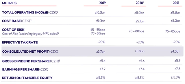 V letošním roce vedení Monety očekává čistý zisk minimálně 3,7 miliardy Kč při celkových provozních výnosech na úrovni minimálně 10,3 miliardy Kč. Dividenda by měla podle banky činit nejméně 5,40 Kč na akcii. Do roku 2021 by se měl čistý zisk zvýšit na minimálně 4 miliardy Kč a dividenda ze zisku za rok 2021 by měla dosáhnout nejméně 5,90 Kč na akcii.