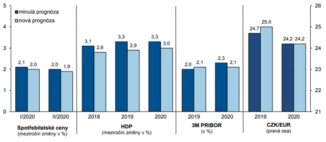 Inflace by měla v prvním čtvrtletí 2020 činit 2,0 % (předchozí prognóza: 2,1 %), v druhém čtvrtletí 2020 by měla klesnout na 1,9 % (předchozí prognóza: 2,0 %).