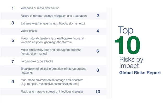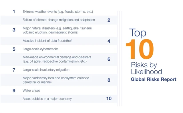 Podle publikace Global Risks Report, kterou pravidelně vydává Světové ekonomické fórum, hrají environmentální rizika prim mezi největšími hrozbami již třetí rok po sobě. "Ze všech rizik, která sledujeme, jsou právě ta související se životním prostředím nejnebezpečnější a směřují svět do katastrofy," píše se ve zprávě.