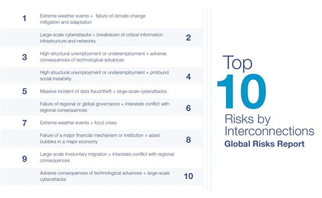 Rizika neexistují izolovaně, jsou propojena a každé má potenciál ovlivnit ta ostatní. Když se například podíváme na ztrátu biologické rozmanitosti v potravinovém řetězci lidí, ta může ovlivňovat zdravotní a socioekonomický vývoj a mít negativní vliv například na produktivitu nebo regionální bezpečnost. Poslední žebříček řadí rizika právě podle propojenosti a vzájemného ovlivňování.