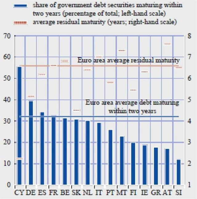 První graf zobrazuje podíl vládního dluhu splatného v nejbližších dvou letech (jako procento celku, modré sloupce) a průměrnou zůstatkovou splatnost existujícího dluhu (pravá osa, v letech, červená čára).