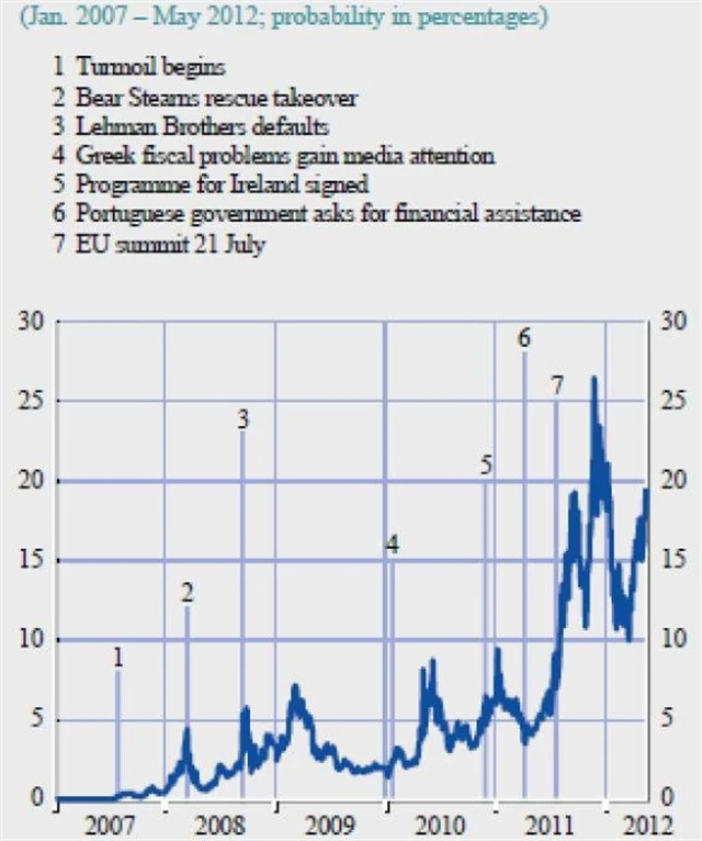 Je vidět, že pravděpodobnost byla relativně nízká nejen po záchraně Bear Stearns v březnu 2008 či pádu Lehman Brothers v září 2008, ale i v první fázi dluhové krize v EMU (body 4 až 6, kde 5 je žádost Irska o pomoc a 6 žádost Portugalska).