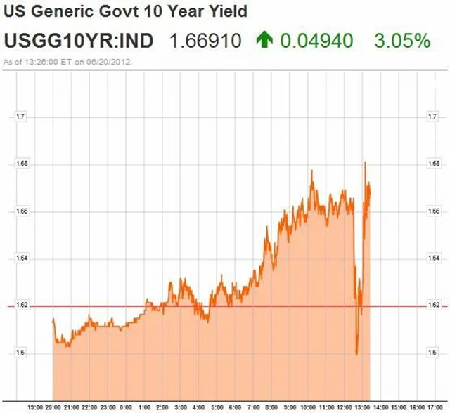 Fed prodloužil a navýšil program směny dluhopisů, operaci Twist, do konce roku, a sice o 267 miliard dolarů. Trhy čekaly něco víc, větší podporu ekonomiky, respektive v ni doufaly, a tak akcie po zprávě propadly na denní minima. Nálada se ovšem vzápětí zlepšila, což bylo vidět i na trhu s americkými státními dluhopisy. Fed je připraven v případě potřeby podpořit ekonomiku i v dalších měsících. Je ovšem otázka, zda si před volbami dovolí takový zásah do ekonomiky, jakým by bylo QE3.