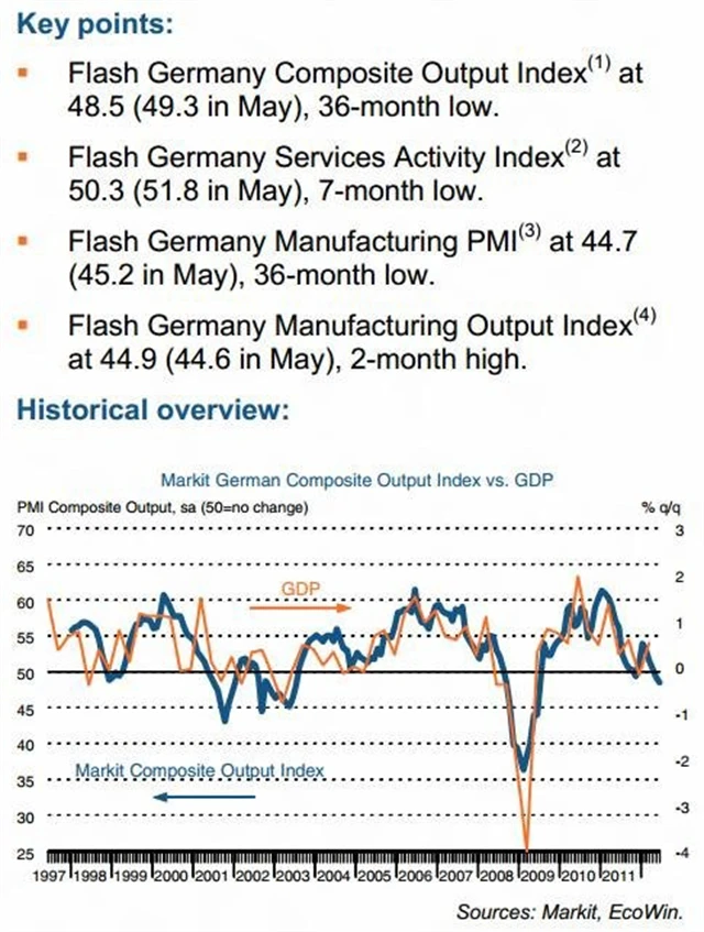 Index nákupních manažerů, velice spolehlivý indikátor budoucího vývoje ekonomiky. V Německu jsou aktuální čísla špatná - v některých oblastech až tříletá minima. Krizi v Evropě Německo dlouho odolávalo, ovšem přirozený pokles poptávky po jeho exportu v řadě evropských zemí si vybírá svou daň. Další pokles dnes dopoledne hlásí i Čína, celá eurozóna pak podle PMI klesla již popáté v řadě.