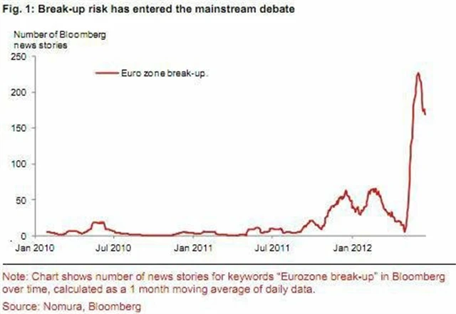 O problémech eurozóny se ví dva roky, pokud jste pozorní konzumenti renomovaných médií, nebo třeba 15 let, pokud jste Petr Robejšek nebo někdo ze zástupu euroskeptických jasnovidců. Případně něco mezi, pokud si umíte dělat názor na základě makrodat a dalších indikátorů. O "rozpadu eurozóny" se jistě mluvilo již dříve, až loni na podzim ovšem začal raketově růst výskyt tohoto pojmu ve světových médiích.