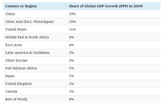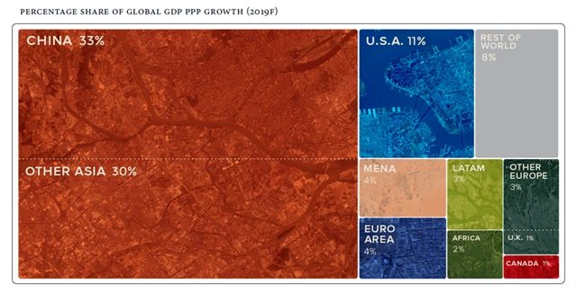 Na základě dat banky Standard Chartered a Mezinárodního měnového fondu vytvořil web Visual Capitalist mapu podílu jednotlivých regionů na světovém růstu podle parity kupní síly. Samotná Čína má na růstu globálního HDP více než třetinový podíl.
