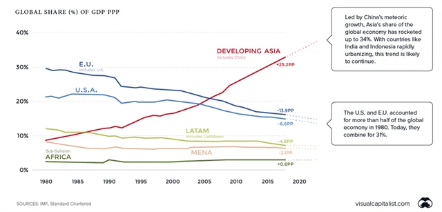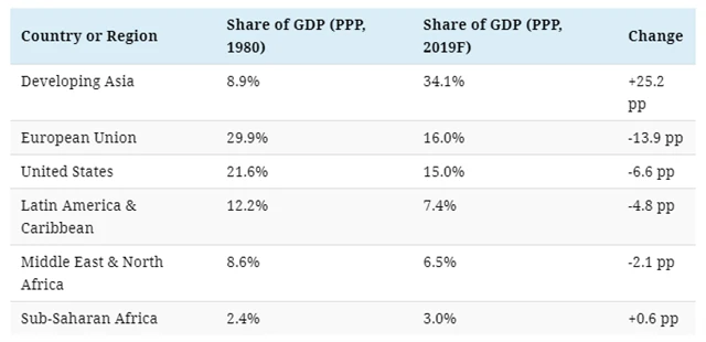 V 80. letech byl podíl USA a Evropy na světovém HDP 51,5 %, nyní je to pouze 31 %. Klesá také podíl Jižní Ameriky a Středního východu a Severní Afriky (MENA). Podíl rozvíjejících se zemí Asie (Čína, Indie a další rychle rostoucí ekonomiky) na celkovém HDP naopak vzrostl z 8,9 % na 34,1 %.
