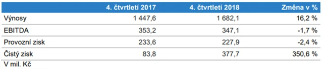 Za samotné čtvrté čtvrtletí firma vykázala tržby 1,68 miliardy Kč (+16,2 %), provozní zisk EBITDA 347,1 milionu Kč (-1,7 %) a čistý zisk 377,7 milionu Kč (+350,6 %).