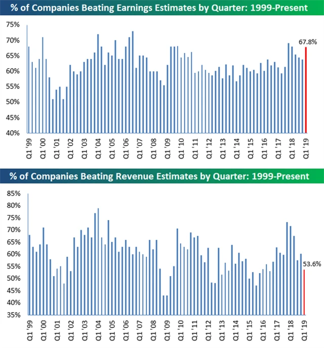 Podíl amerických firem překonávajících odhady analytiků, zdroj: Bespoke Investment Group