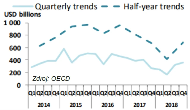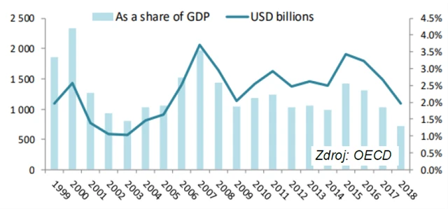 (Technická poznámka: Objemy investic dovnitř zemí a ven z nich by se globálně měly z definice rovnat, ale v praxi mezinárodních statistických databází se nerovnají. OECD proto reportuje průměr obou objemů.)