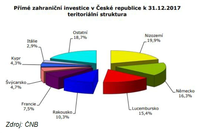 Nejspíše i proto, že investice z USA v Česku nejsou objemově nijak významné, jsou součástí kolonky "Ostatní" v grafu níže. Je však potřeba upozornit, že data vypovídají o zemi původu bezprostředního investora, nikoli konečného vlastníka. Například Škoda Auto je v grafu zařazena jako lucemburská firma, protože její akcie formálně drží (ponechme stranou proč) lucemburská firma Volkswagen Finance Luxemburg. Konečnými vlastníky jsou ovšem německý stát Dolní Sasko a další akcionáři (akcionářů) Volkswagenu.