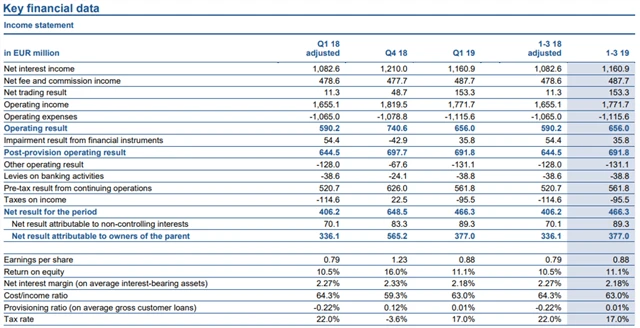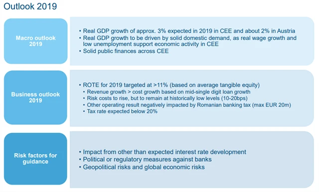 "Ze současného pohledu jsme skvěle připraveni splnit své cíle pro rok 2019," uvedl generální ředitel Andreas Treichl. Upozornil, že příjmy rostou rychleji než náklady, úvěrová rizika jsou nízká a návratnost hmotného kapitálu zůstává vysoká.