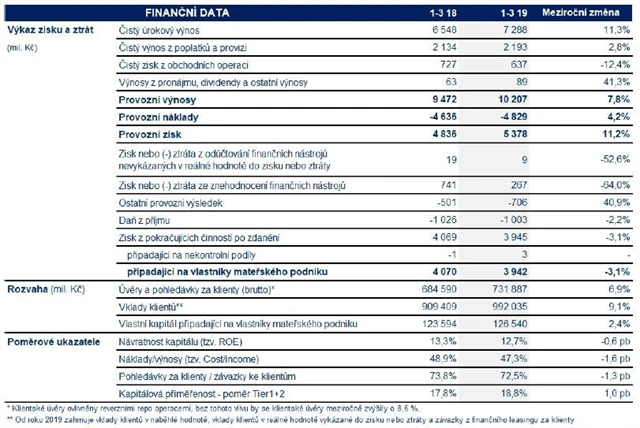 Čistý úrokový výnos vzrostl ve srovnání s prvním čtvrtletím roku 2018 o 11,3 % na 7,3 miliardy Kč a čistý výnos z poplatků a provizí se zvýšil o 2,8 % na 2,2 miliardy Kč. Čistý zisk z obchodních operací naopak meziročně klesl o 12,4 % na 0,6 miliardy Kč.