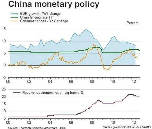 jak ukazuje graf, snižování sazeb v Číně velice dobře koresponduje s hospodářským oživením. jasně patrné to bylo například po kolapsu banky Lehman Brothers.