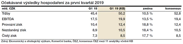 "Podle našich odhadů výroba elektrické energie ČEZ v prvním čtvrtletí meziročně vzrostla o zhruba 4 % a přiblížila se 17 TWh. Výroba jaderných elektráren se meziročně zvýšila o téměř 8 % a dosáhla 7,7 TWh. U uhelných elektráren odhadujeme pouze mírný nárůst s celkovou produkcí na úrovni 7,5 TWh. Kromě vyšší výroby se na očekávaném růstu tržeb o 10,5 % projevují i vyšší realizované ceny. Zisk EBITDA by dle našich odhadů měl růst o 13,5 %, když na straně nákladů bude největší meziroční rozdíl v položce emisních povolenek," napsal analytik Miroslav Frayer z Komerční banky.