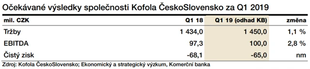 "Z dlouhodobého pohledu sezónnosti patří první čtvrtletí pro Kofolu ČS k nejméně úspěšným obdobím. Za poslední čtyři roky na něj připadá jen asi 19 % celoročních tržeb. Předpokládáme, že výsledky firmy pozitivně ovlivní několik faktorů. Tím prvním jsou meziročně nižší ceny cukru, druhým je mírný pokles cen ropy a třetím to, že je uplynulý kvartál poslední, v rámci kterého se v číslech Kofoly objevuje problematická HOOP Polska. Tato společnost byla k 18. březnu prodána firmě ZMB Capital a již není součástí Kofoly. Meziročně by mělo dojít k mírnému růstu tržeb o 1,1 % na 1,45 miliardy Kč. Díky nižším cenám vstupních komodit by mělo dojít ke zlepšení ziskovosti firmy, očekáváme EBITDA 100 milionů Kč (meziročně +2,8 %)," napsal analytik Jiří Kostka z Komerční banky.