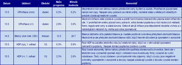 V Evropě se investoři zaměří v úterý na německou inflační statistiku za duben, ve středu na první odhady vývoje ekonomik Německa a Česka v prvním čtvrtletí a na zpřesněnou zprávu o vývoji ekonomiky eurozóny v prvních třech měsících roku. V pátek je na řadě dubnová inflace za celou eurozónu. Vedle toho ještě v úterý v Británii vyjdou data z trhu práce za první kvartál a institut ZEW zveřejní květnové indexy ekonomického sentimentu pro Německo a celou eurozónu.