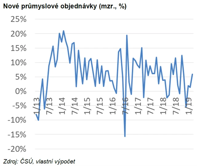 Další dobrá zpráva se týká průmyslových objednávek. Ty se meziročně zvýšily za celý průmysl o 6 %. V pozadí zrychlování růstu je zejména vyšší zájem ze strany domácích odběratelů (růst přes 14 %), zatímco ze zahraničí to není žádná sláva (jen lehce přes 2 %). Jak je ale z grafu zřejmé, jde o poměrně kolísavou veličinu, takže je potřeba držet optimismus na uzdě.