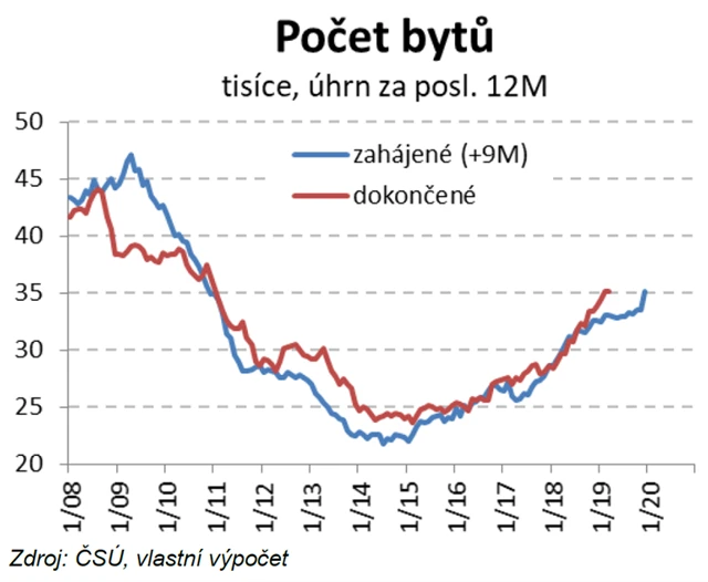 Zahajování výstavby bytů se letos v březnu probralo. Počet zahájených bytů (modrá čára) je v grafu níže posunut o 9 měsíců do budoucna, protože po tomto posunu se zdá, že celkem slušně predikuje vývoj počtu dokončených bytů (červená čára). Postavení bytu podle všeho v průměru trvá zhruba těchto 9 měsíců.