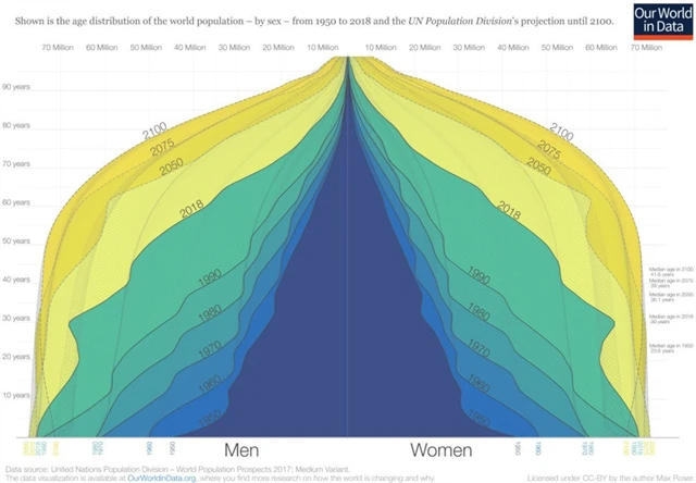Méně narozených dětí v kombinaci se zlepšující se zdravotní péčí (zejména v rozvíjejících se zemích) dramaticky (z)mění tvar věkové pyramidy.