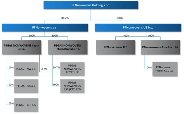 PFNonwovens je součástí holdingové společnosti PFNonwovens Holding ovládané investiční společností R2G Rohan Czech podnikatele Oldřicha Šlemra. R2G má v PFNonwovens téměř 90% podíl. Součástí holdingu je dále společnost PFNonwovens US a její dceřiné podniky.